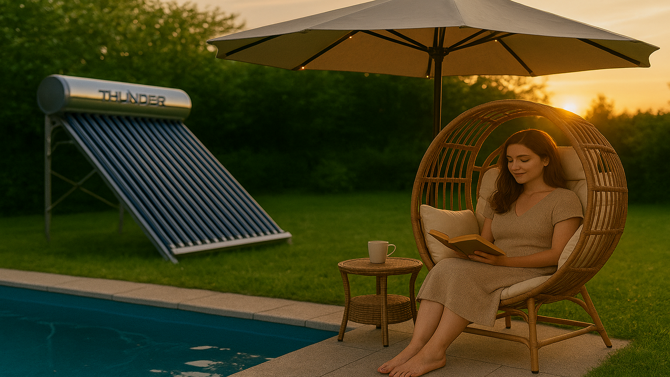 Privirea ei se oprește în partea din spate a terenului, unde colectoarele solare pentru încălzirea apei strălucesc în soare. Funcționarea lor este simplă, dar fascinantă: absorb radiația solară și o transformă în căldură, care apoi încălzește apa din sistem. Datorită acestui fapt, gospodăria lor economisește energie și, în plus, reduce amprenta ecologică.