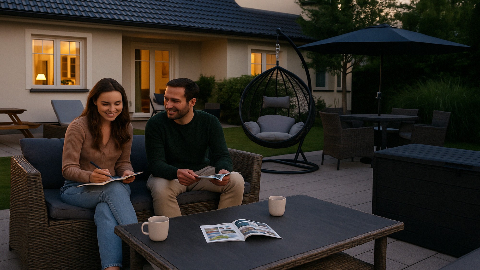 Amândoi privesc visători spre terasa lor – nu lipsesc umbrelă mare, șezlonguri și, bineînțeles, o cutie practică pentru pături și perne.
