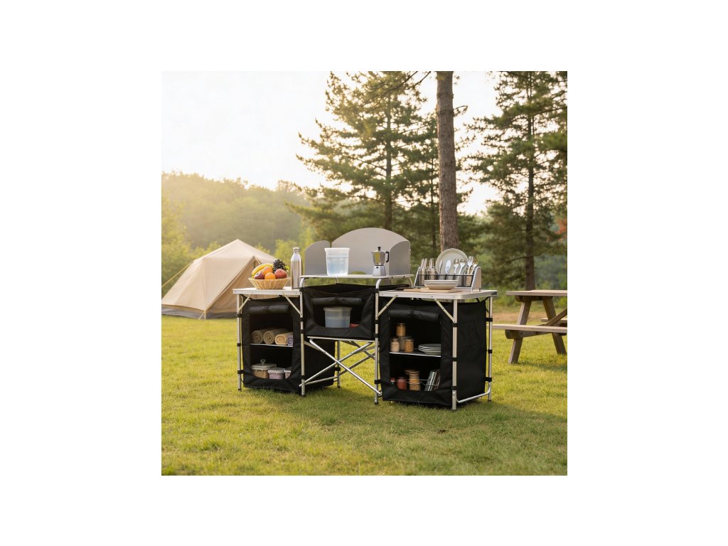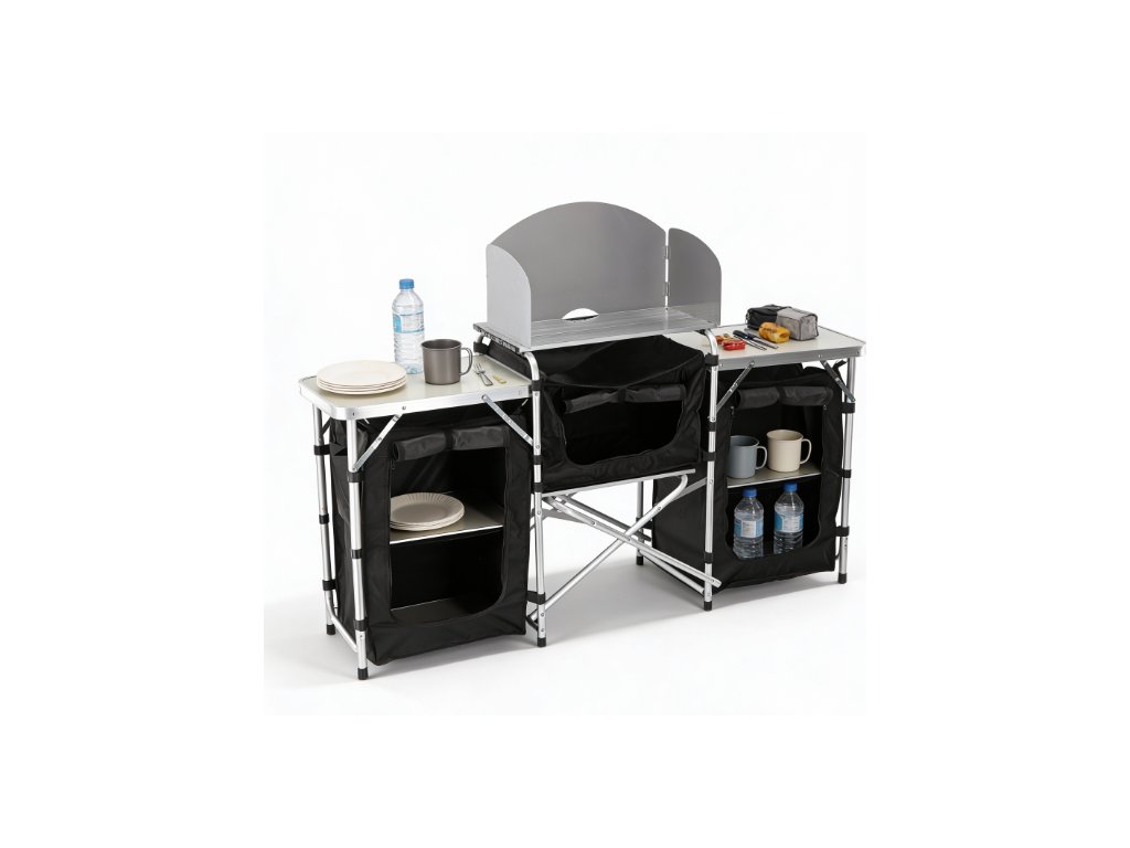O bucătărie pliabilă de camping funcționează ca un spațiu de lucru stabil pentru gătitul în aer liber. Când este desfăcută, creează trei zone de lucru separate, care vă permit să separați pregătirea alimentelor, gătitul și depozitarea echipamentelor. Datorită construcției sale din aluminiu și plăcilor solide din MDF, oferă o stabilitate comparabilă cu cea a unei bucătării de acasă, chiar și pe teren.