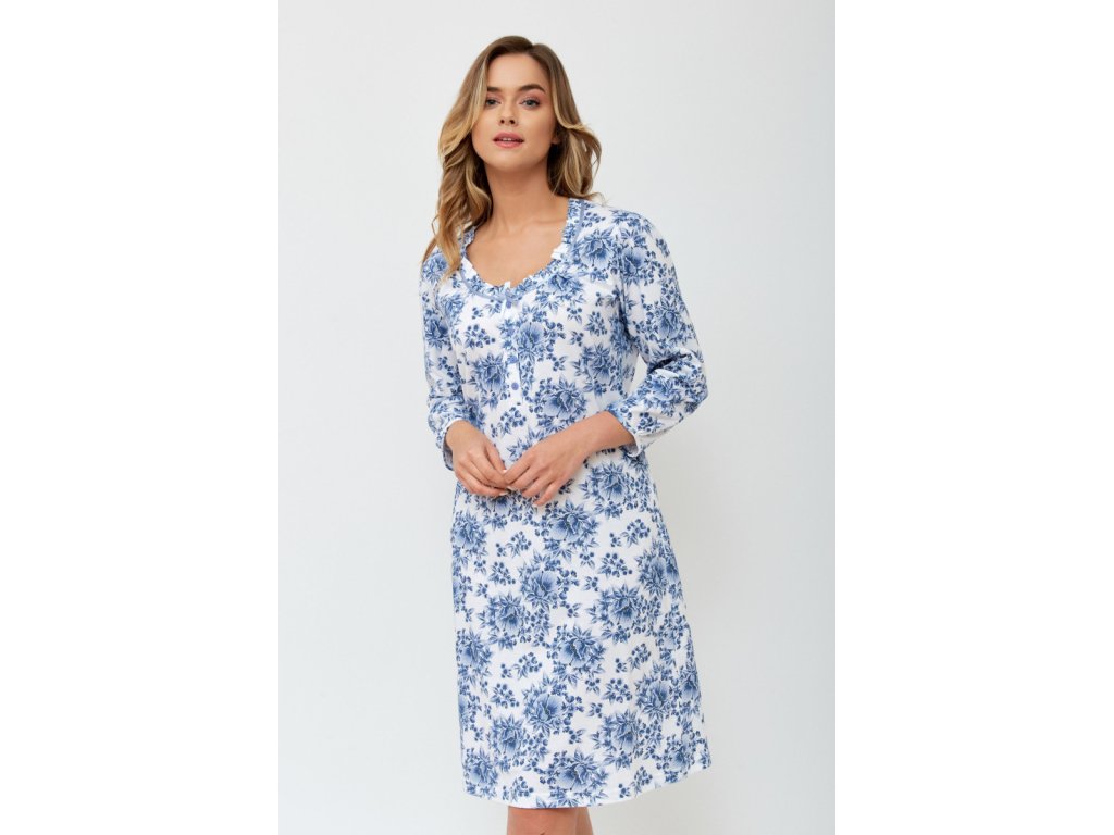 Lungimea până la genunchi, croiala liberă și mânecile 3/4 asigură libertate de mișcare. Decolteul rotund cu nasturi și tiv cu dantelă conferă un aspect romantic și feminin. Combinația alb-albastru cu model floral conferă o senzație de relaxare și liniște. Buzunarul de pe piept este nu numai practic, ci și elegant. Ideal pentru nopțile de vară.
