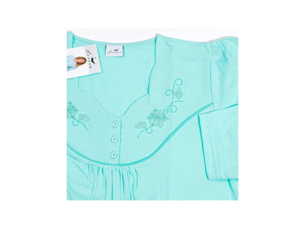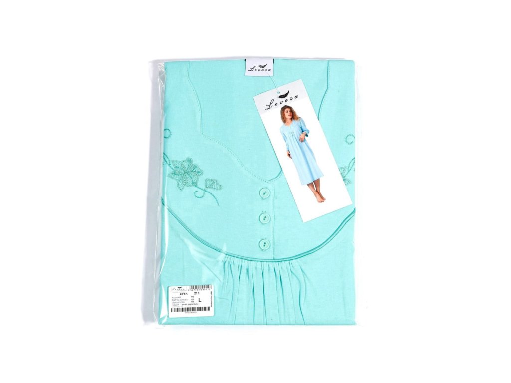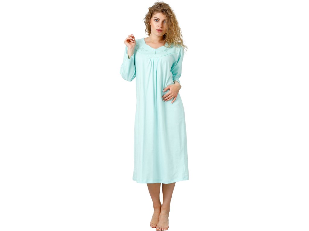 Fabricată din 100% bumbac, este delicată, respirabilă și potrivită și pentru pielea sensibilă. Bumbacul garantează o senzație naturală de uscăciune și prospețime pe tot parcursul nopții. Are o croială lejeră, cu pliuri în zona pieptului. Lungimea până la gleznă este ideală pentru femeile care apreciază confortul și decența. Decolteul delicat în V, cu ornamente și nasturi, conferă un aspect delicat și elegant. Mânecile lungi sunt apreciate mai ales în serile mai răcoroase.