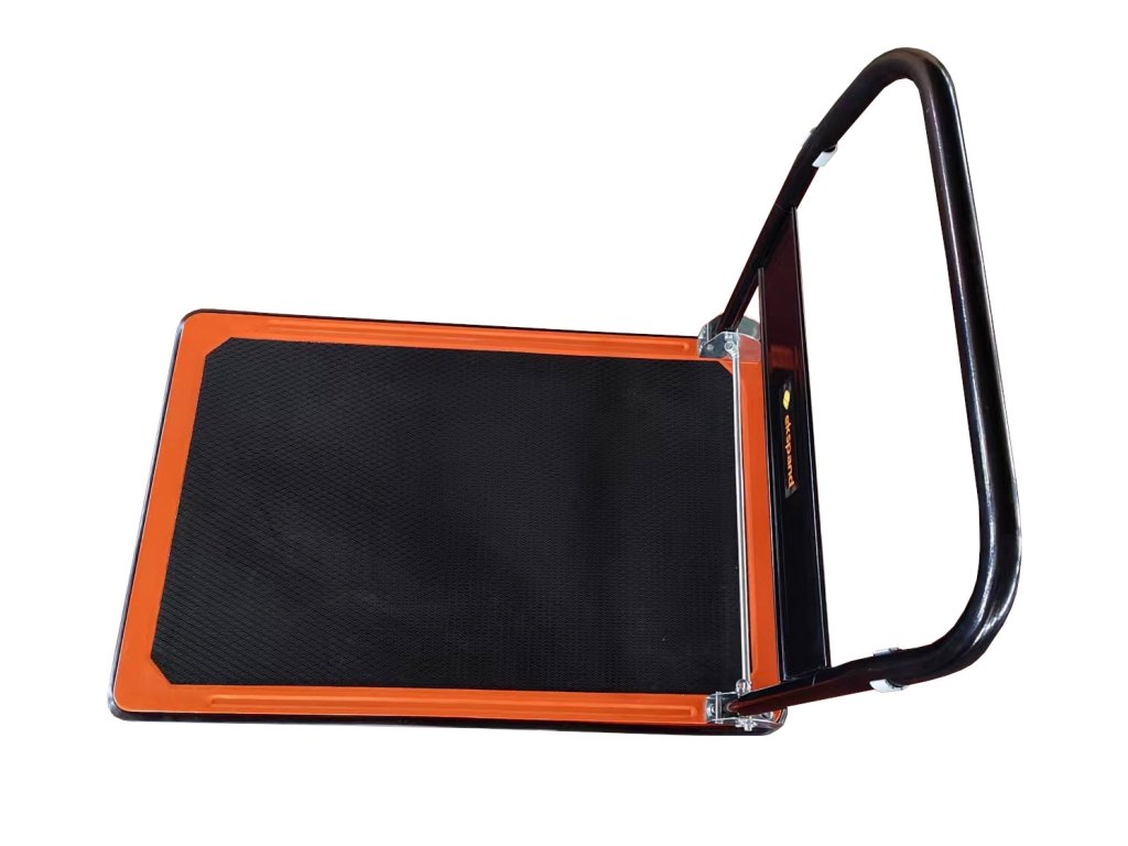 Baza căruciorului pliabil WM04 este o platformă metalică solidă cu suprafață antiderapantă, care asigură stabilitatea încărcăturilor cu greutatea de până la 300 kg în timpul transportului. O bandă de cauciuc înconjoară perimetrul platformei de 47 × 73 cm, care absoarbe șocurile la contactul cu pereții, rafturile sau ușile și protejează, de asemenea, mărfurile transportate împotriva deteriorării. Greutatea căruciorului de 7,5 kg contribuie la manipularea echilibrată și controlul mișcării.