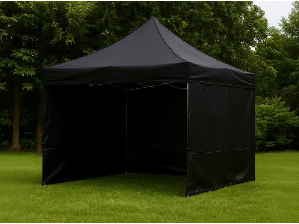Cort pliabil 3 x 3 m negru, greutate: 28 kg, înălțime reglabilă între 190 și 220 cm, construcție din aluminiu, picior hexagonal stabil, acoperiș impermeabil 820D (400 g/m²), pereți laterali 420D (165 g/m², 3 bucăți), dimensiuni cort pliat 160 x 25 x 25 cm