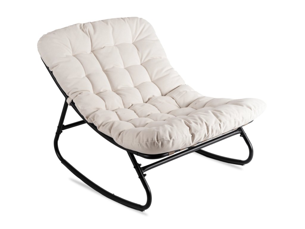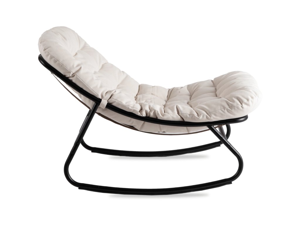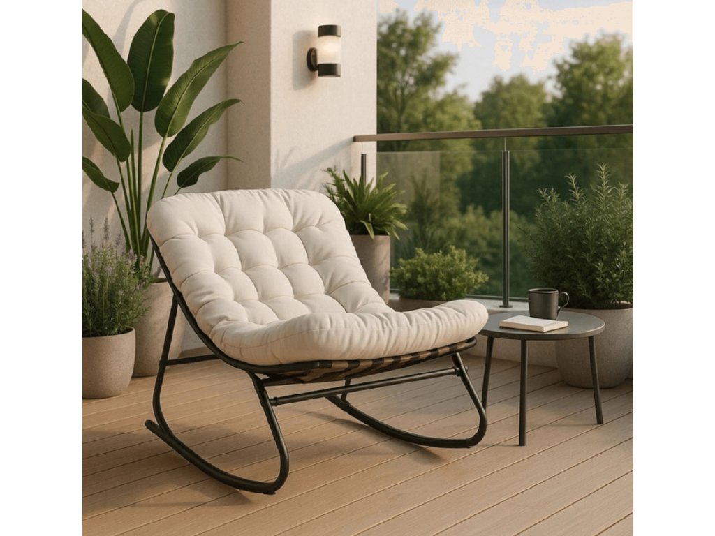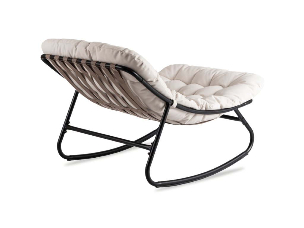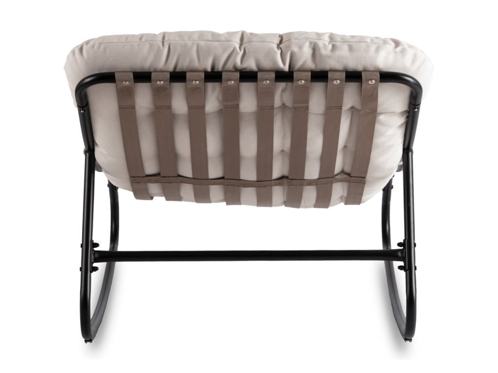 Da, structura metalică cu un tratament special al suprafeței asigură faptul că fotoliul balansoar Aurora bej poate fi utilizat și în aer liber, pe terasă, balcon sau în seră.