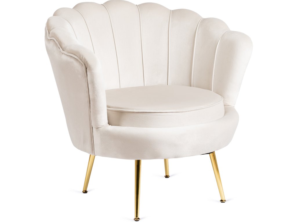 Velurul crem combinat cu structura metalică aurie creează un aspect elegant și atemporal. Fotoliul se integrează în interioare luminoase, minimaliste sau cu accente luxoase și poate completa inclusiv spații de tip loft. Picioarele metalice aurii sunt prevăzute cu protecții pentru stabilitate și contact sigur cu podeaua.