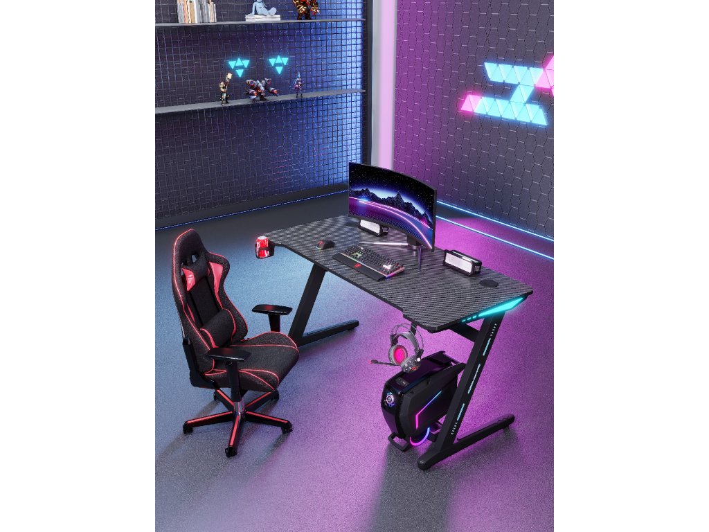 Benzile LED RGB de pe părțile laterale ale blatului creează o atmosferă unică pentru gaming și lucru. Iluminatul poate fi conectat prin USB, iar culoarea sau efectul pot fi ajustate în funcție de starea ta de spirit. Manșoanele practice pentru cabluri mențin spațiul tău ordonat, în timp ce suportul pentru pahare și cârligul pentru căști asigură un confort maxim.