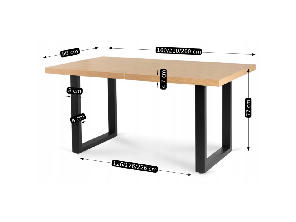 Masa are o funcție extensibilă, permițându-ți să reglezi lungimea în funcție de necesități. Două piese suplimentare vă permit să extindeți masa de la 160 cm la 260 cm. Este soluția ideală pentru sărbători de familie, cine comune și reuniuni mai mari acasă. Panourile extensibile se depozitează separat, astfel încât să nu interfereze cu structura mesei.