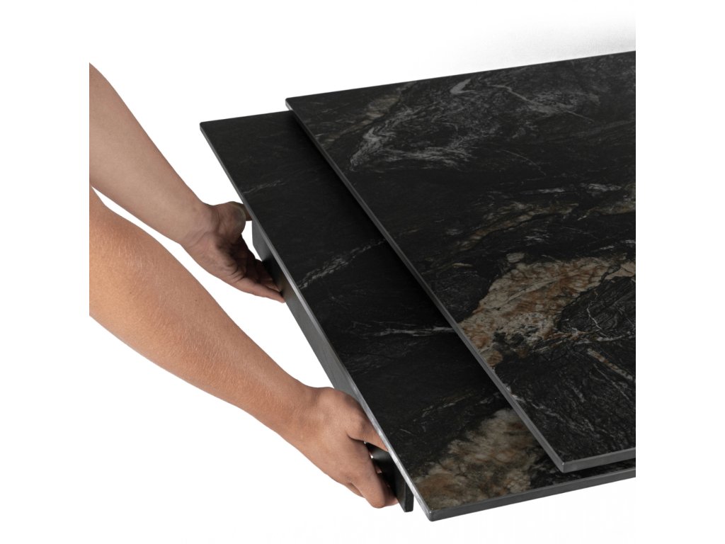 Blatul mesei este fabricat din cuarț sinterizat cu finisaj din marmură neagră, rezistent la zgârieturi, căldură și umiditate.