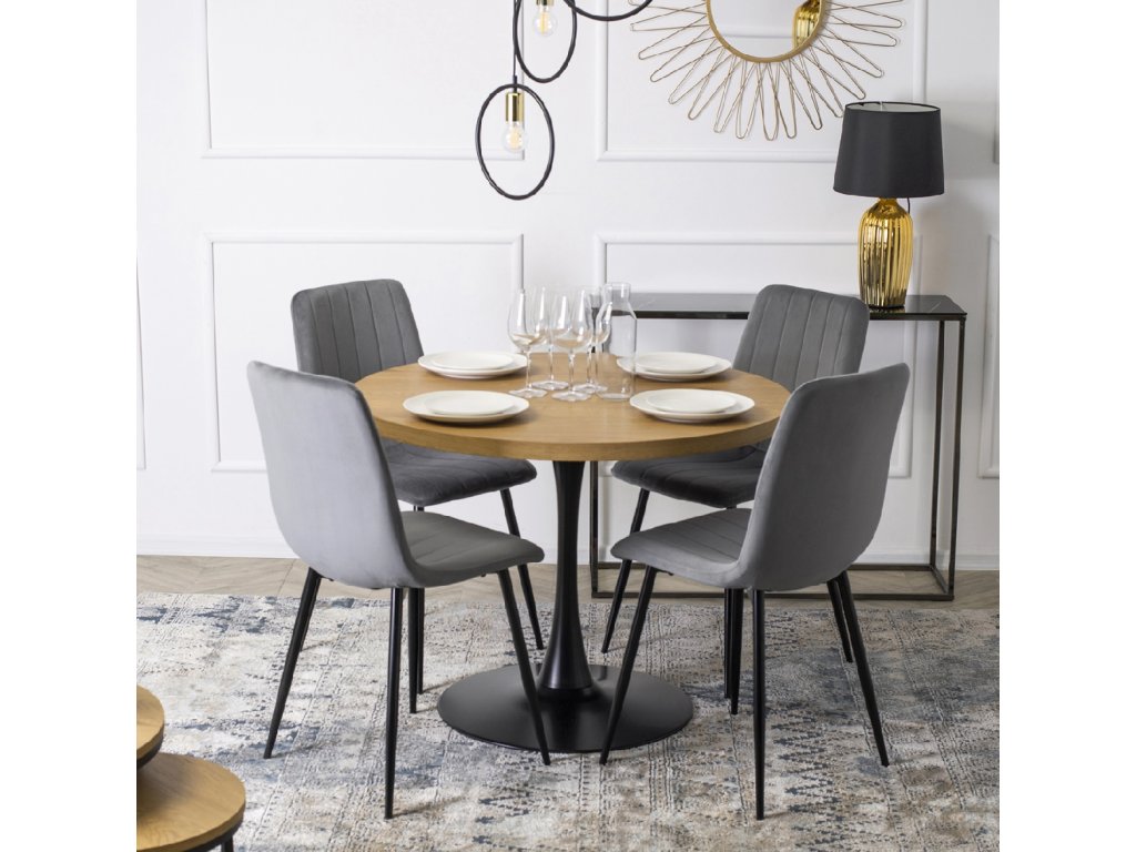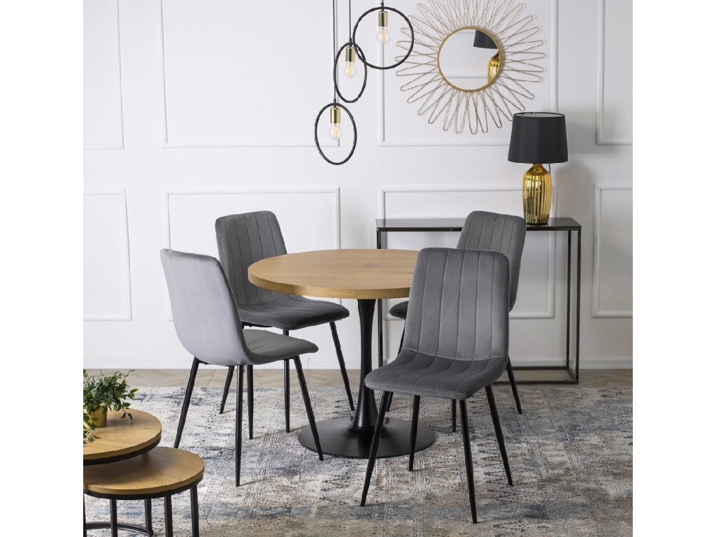 Cu un diametru de 100 cm, oferă suficient spațiu pentru patru persoane, indiferent dacă este utilizată în sufragerie, în sala de mese sau într-o bucătărie mai mică. Baza metalică stabilă menține masa ferm în poziție, iar tampoanele de protecție împiedică alunecarea și zgârierea podelei. Înălțimea ideală de 75 cm permite combinarea cu majoritatea scaunelor de sufragerie standard.