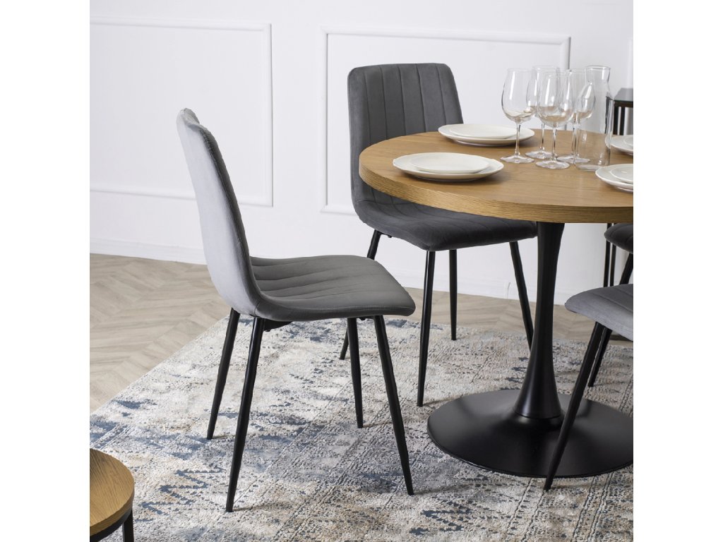 Se potrivește bine cu scaune din metal, catifea și piele în culori negru, gri sau bej, în funcție de stilul interiorului.