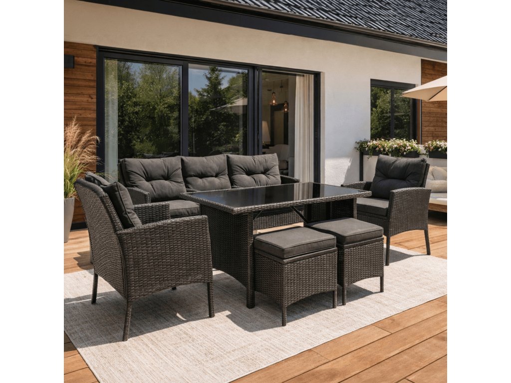 Mobilierul de grădină Atlanta este un set din tehnoratan pentru aproximativ 4-6 persoane, conceput pentru terase, grădini, foișoare sau balcoane mai mari. Setul complet de mobilier de grădină include o canapea cu trei locuri, două fotolii, două pufuri și o masă cu blat din sticlă. Cu această combinație, puteți crea rapid un loc confortabil pentru relaxare, pentru reuniuni de familie sau pentru petreceri seara, în aer liber.