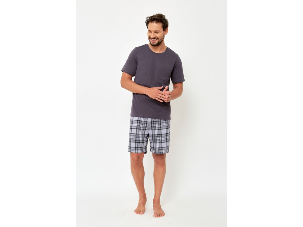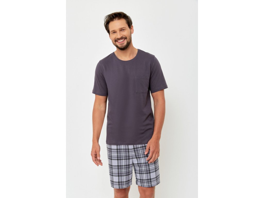 Tricoul monocromatic cu guler rotund și mâneci scurte este completat de pantaloni scurți cu model în carouri și talie elastică. Împreună, creează un look modern, potrivit atât pentru uzul zilnic, cât și pentru odihna nocturnă.