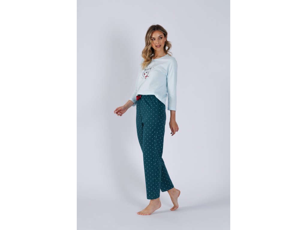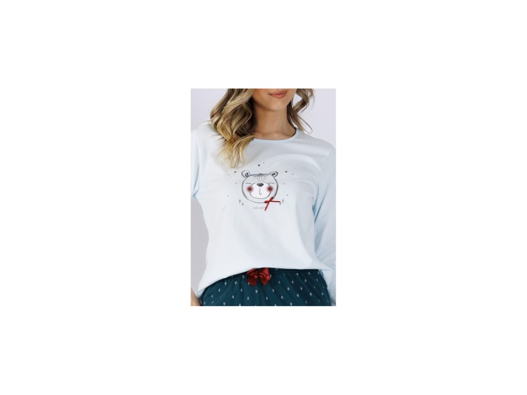 Pijama pentru femei verde deschis Nida este confecționată din bumbac 100%, moale, respirabil și plăcut la atingere. Pijama este potrivită pentru uz zilnic, dar și pentru serile mai răcoroase. Piesa de sus are guler rotund, mâneci lungi și un imprimeu vesel cu un ursuleț zâmbitor cu eșarfă. Pantalonii de culoare verde închis au un model discret cu buline și talie elastică completată cu o fundă roșie.