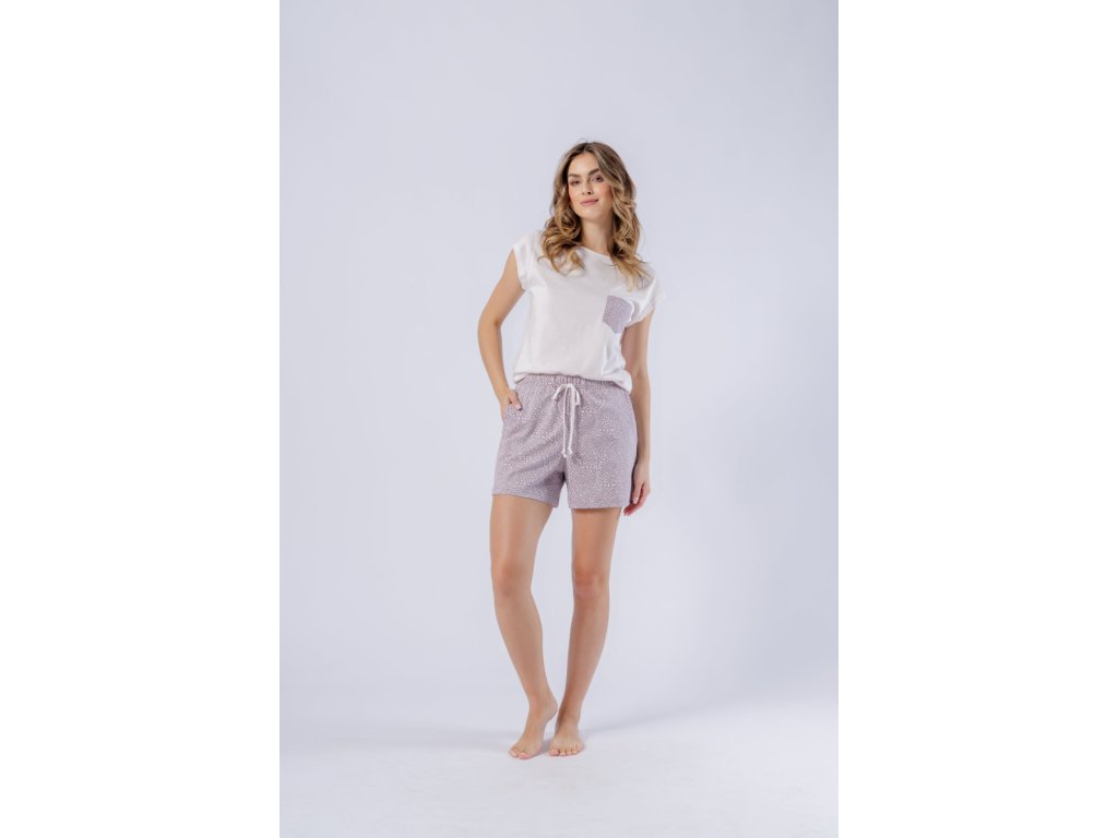 Partea de jos este formată din pantaloni scurți cu un model delicat, talie elastică și șnur alb pentru o ajustare confortabilă. Datorită materialului ușor, nu restricționează mișcarea și sunt ideali și pentru relaxare acasă în timpul zilei.