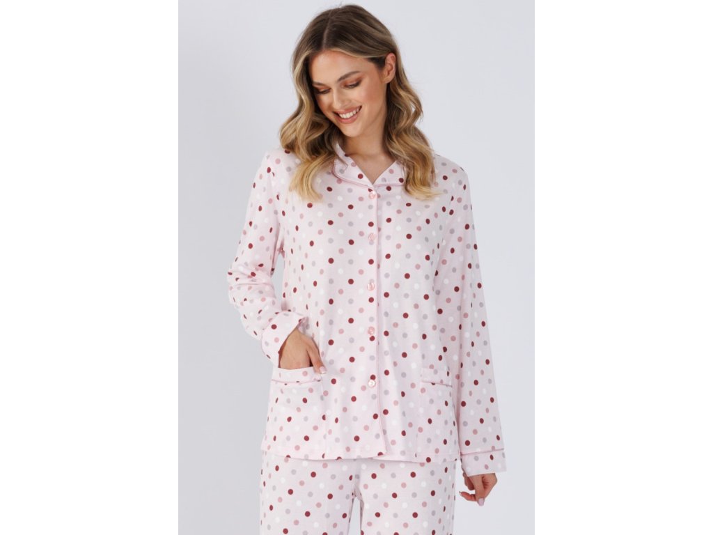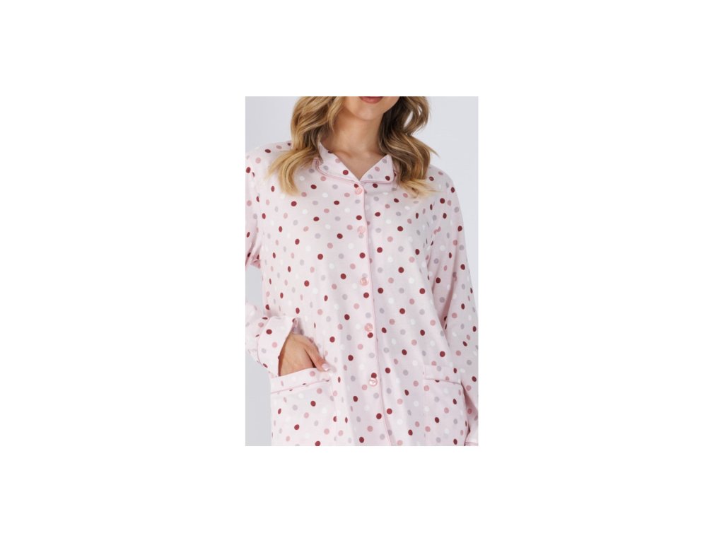 Partea superioară are o croială clasică, cu guler, nasturi și mâneci lungi. Cele două buzunare din față conferă practicitate, iar modelul cu puncte pe fondul deschis este interesant.