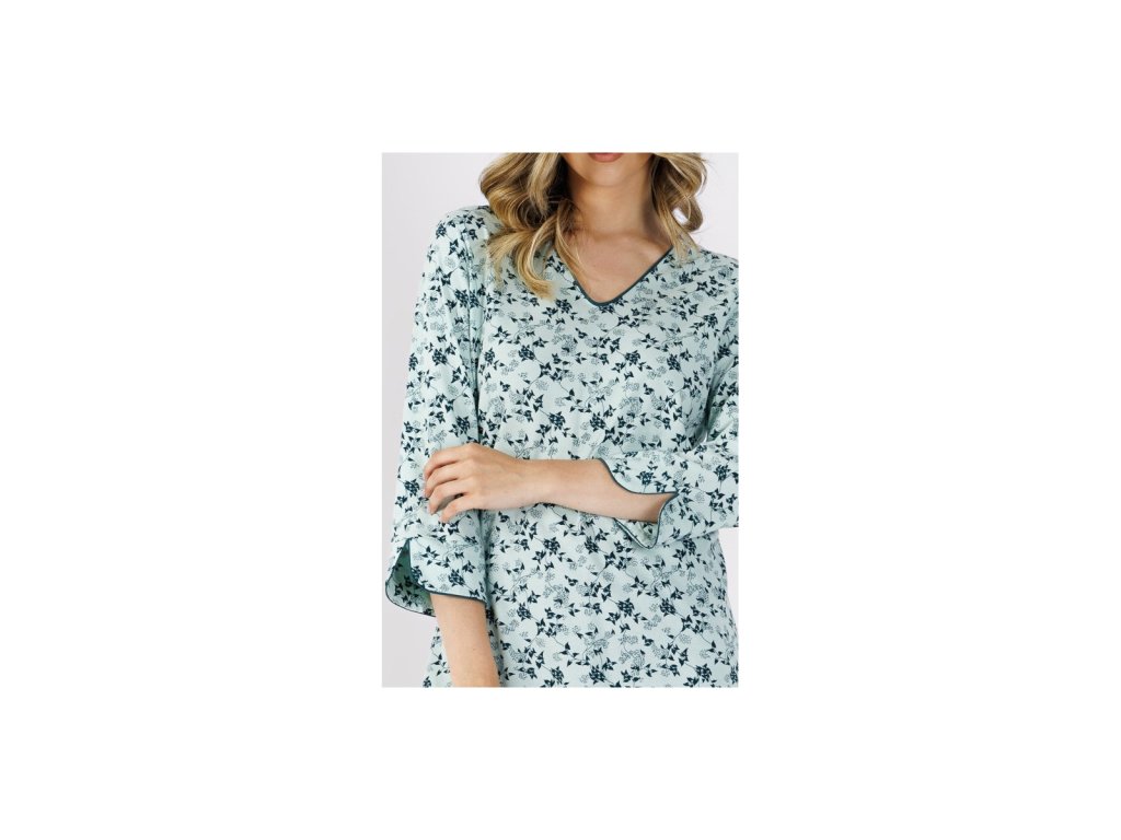 Partea superioară are decolteu în V, mâneci trei sferturi și este decorată cu un model floral delicat în nuanțe delicate de albastru și turcoaz. Croiala este lejeră și confortabilă, ideală pentru a fi purtată toată ziua.