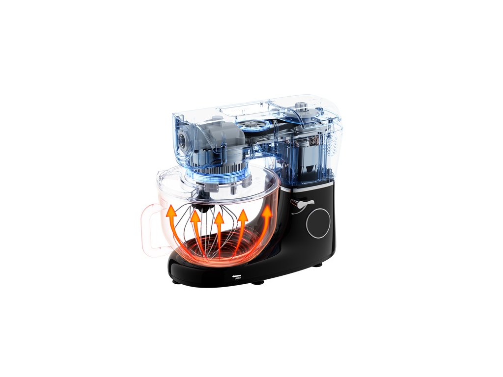 Accesoriile pot fi spălate în mașina de spălat vase, ceea ce facilitează curățarea după coacere. Funcția de memorie, modul de așteptare și nivelul redus de zgomot de 76 dB sporesc confortul utilizatorului. Pachetul include un bol, cârlig pentru aluat, tel, mixer, capac pentru bol, spatulă, separator de ouă, pungă pentru patiserie cu 24 de accesorii într-un organizator, cutie de transport din polistiren, ambalaj colorat și o cutie de transport maro.