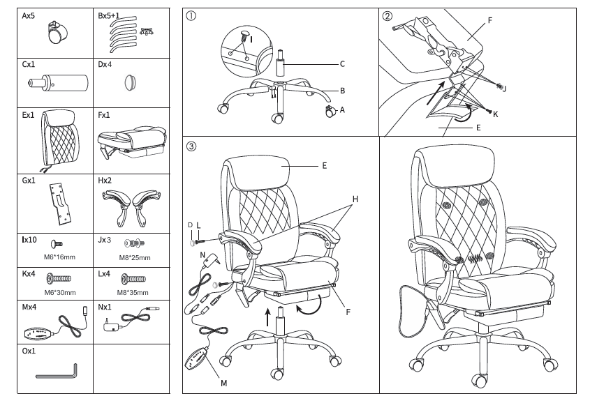 Funcția de masaj (vibrație) cu încălzire este controlată de o telecomandă practică, depozitată în buzunarul lateral al scaunului. Suportul pentru picioare extensibil, spătarul reglabil și forma ergonomică permit o poziționare confortabilă atunci când lucrați sau vă relaxați.
