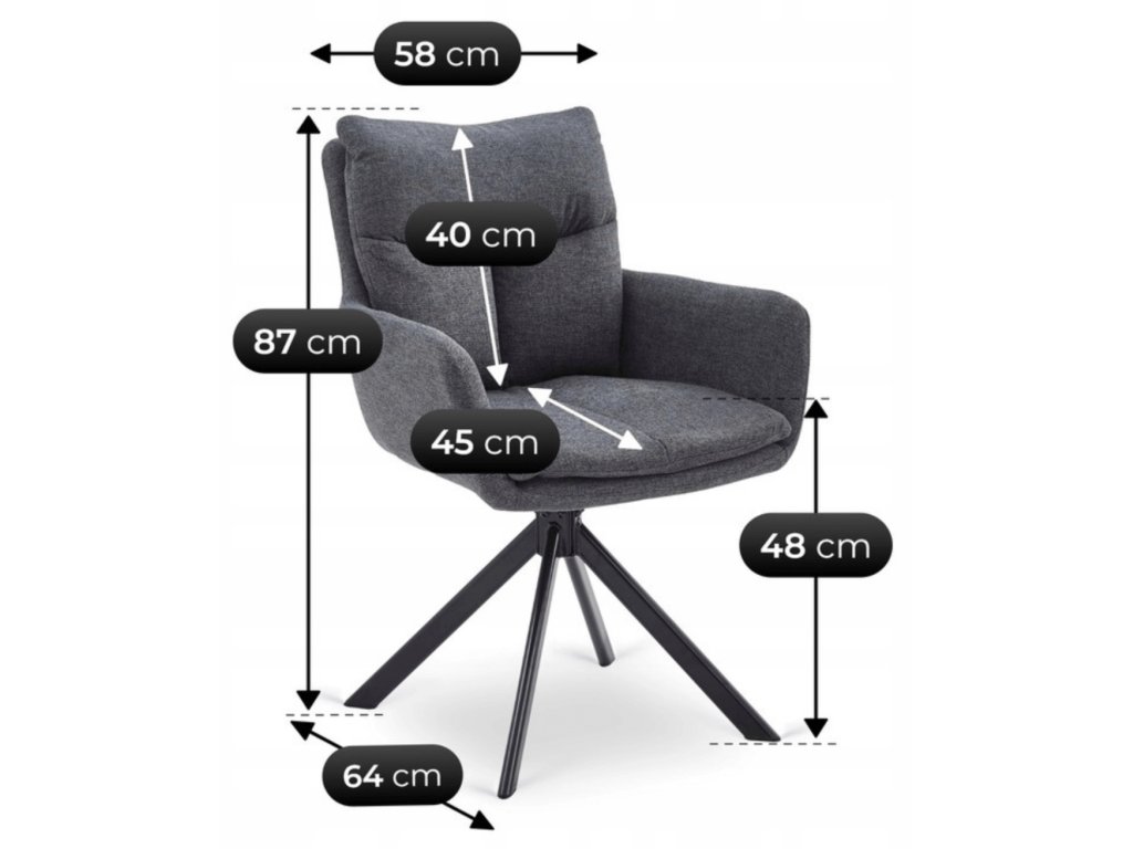Scaunul are o lățime de 58 cm, o adâncime de 64 cm și o înălțime de 87 cm, iar șezutul are o lățime de 43 cm, o adâncime de 45 cm și o înălțime de 48 cm.
