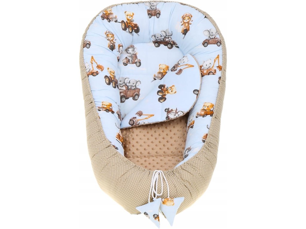 Set pentru pătuț, 7 piese, model: animăluțe, culoare: bej, albastru deschis, turcoaz, material: bumbac, minky, include: cuib, pernă antișoc, pătură, saltea, pernă plată, învelitoare, husă din bumbac, se poate spăla la mașină la temperatură de 40°C.
