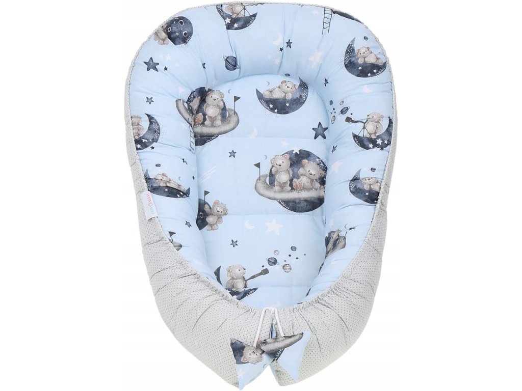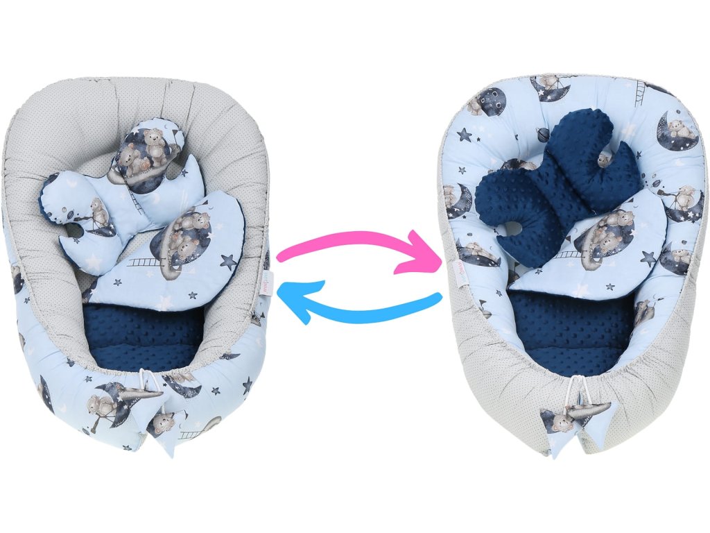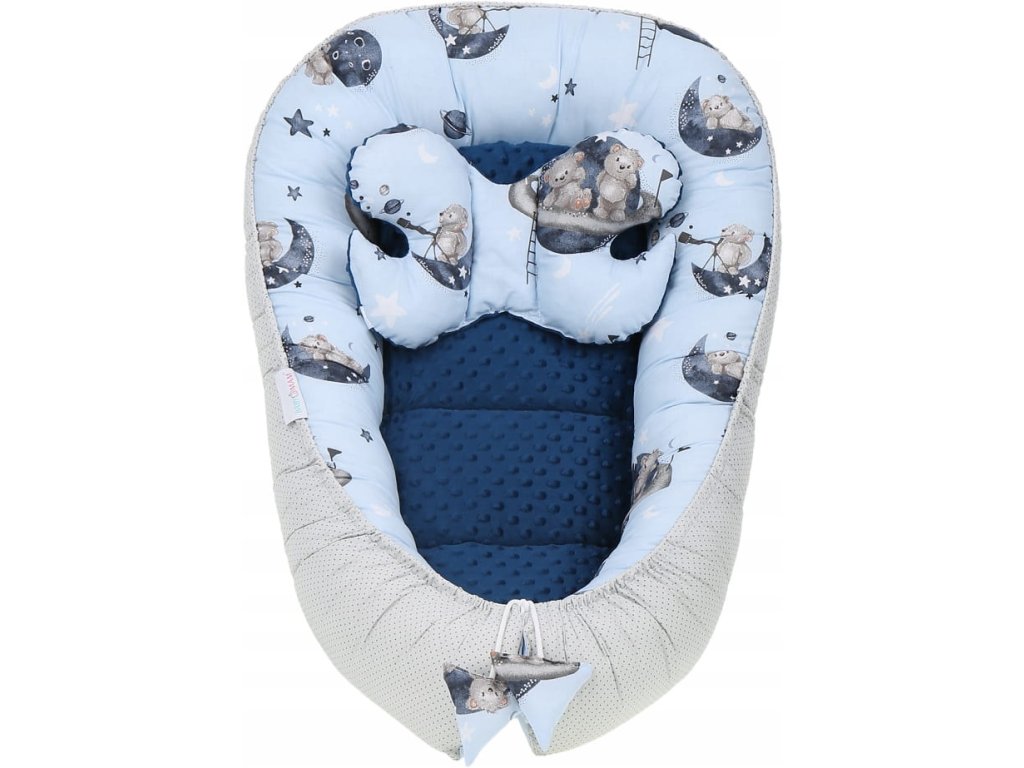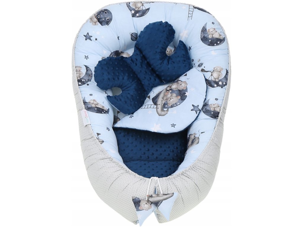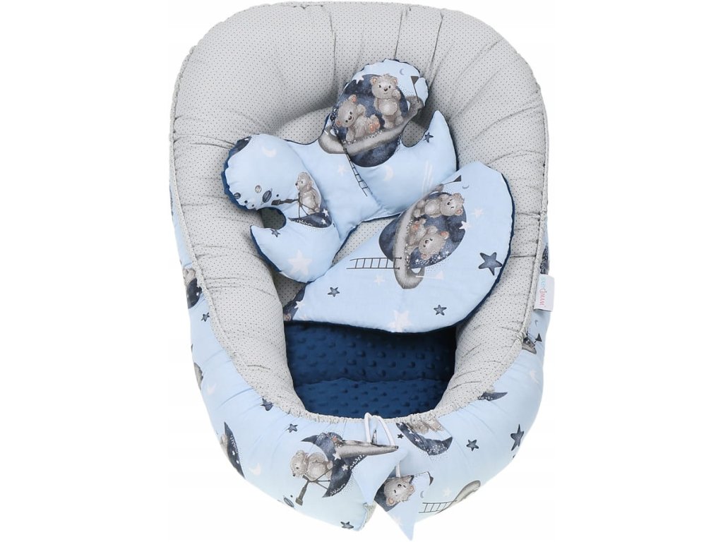 Set pentru pătuț, 7 piese, model: ursuleț, culoare: albastru, gri, material: bumbac, minky, include: cuib, pernă antișoc, pătură, saltea, pernă plată, învelitoare, husă din bumbac, se poate spăla la mașină la temperatură de 40°C.