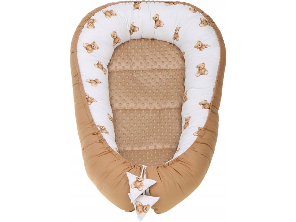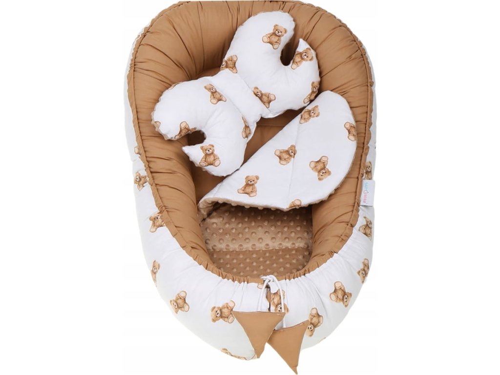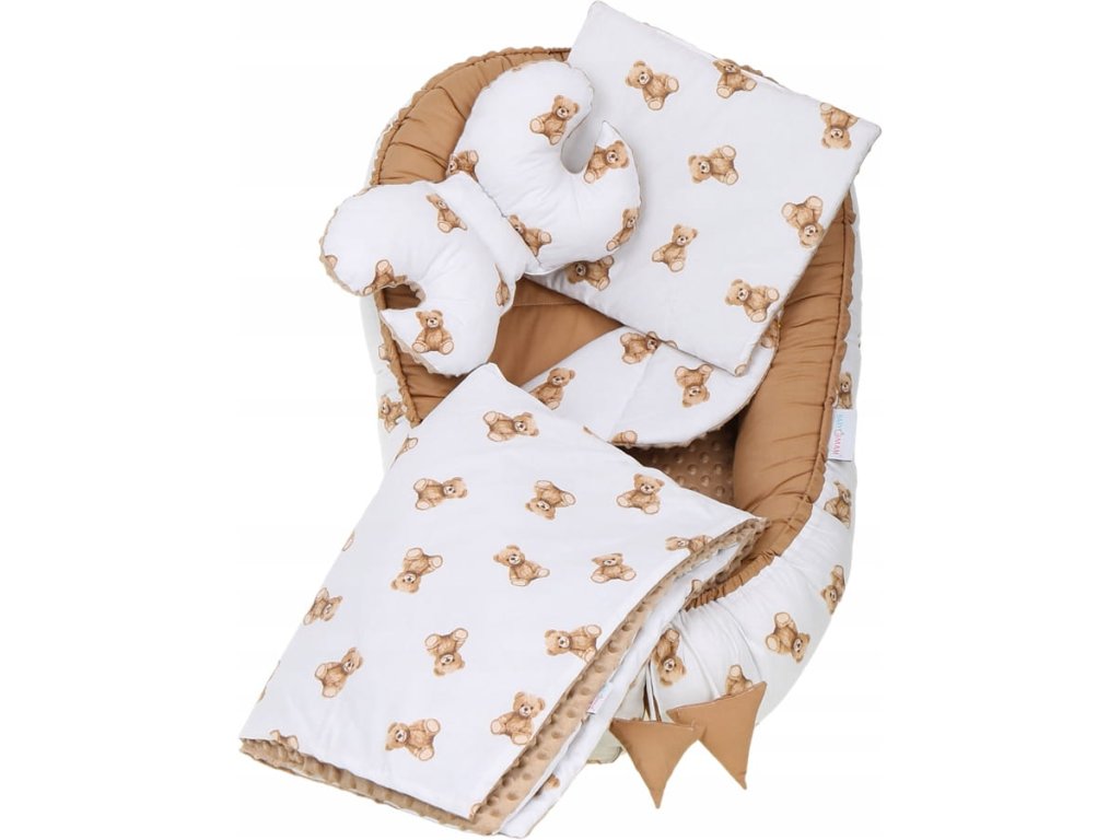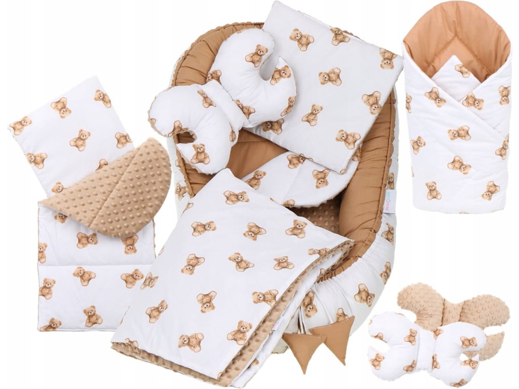 Set pentru pătuț, 7 piese, model: ursuleț, culoare: maro, alb, material: bumbac, minky, include: cuib, pernă antișoc, pătură, saltea, pernă plată, învelitoare, husă din bumbac, se poate spăla la mașină la temperatură de 40°C.